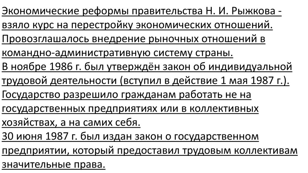 Экономические реформы правительства Н. И. Рыжкова взяло курс на перестройку экономических отношений.Провозглашалось внедрение рыночных отношений в