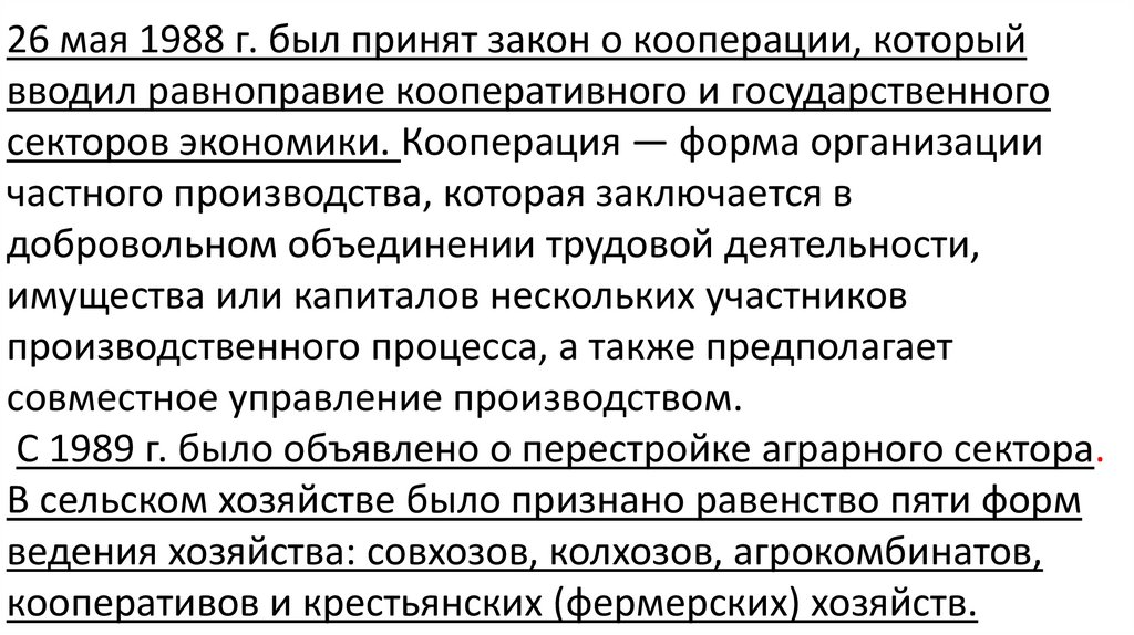 26 мая 1988 г. был принят закон о кооперации, которыйвводил равноправие кооперативного и государственного