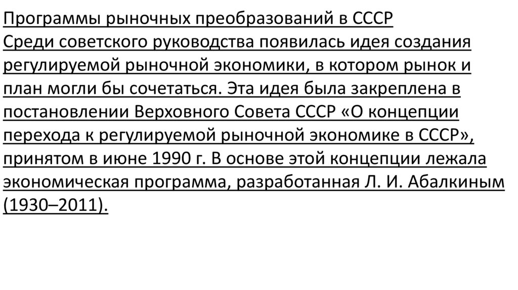 Программы рыночных преобразований в СССРСреди советского руководства появилась идея создания