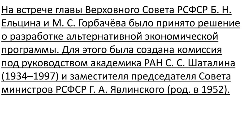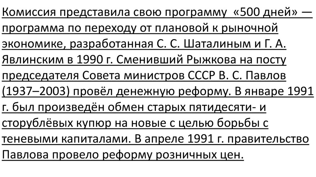 Комиссия представила свою программу «500 дней» —программа по переходу от плановой к рыночной