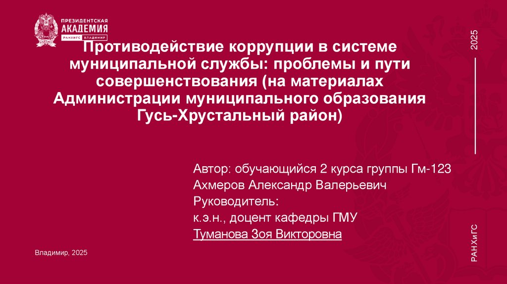1. Противодействие коррупции в системе муниципальной службы: проблемы и пути совершенствования (на материалах Администрации