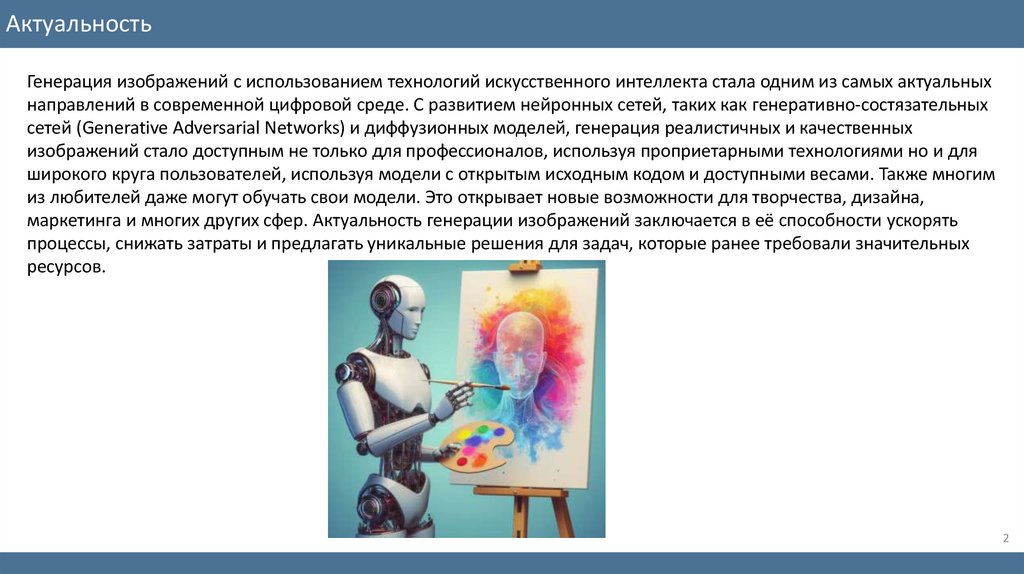 маркетинга и многих других сфер. Актуальность генерации изображений заключается в её способности ускорять