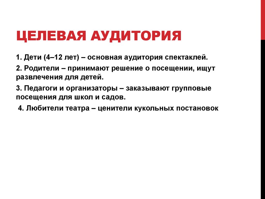 ЦЕЛЕВАЯ АУДИТОРИЯ1. Дети (4–12 лет) – основная аудитория спектаклей.