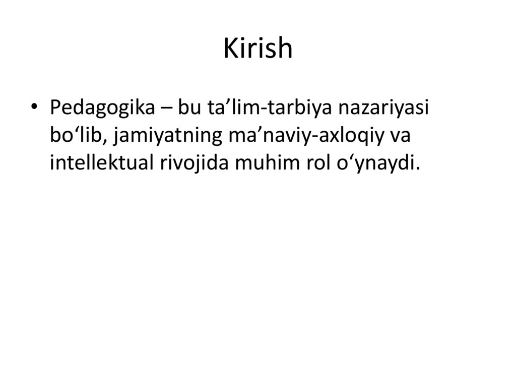 Kirish• Pedagogika – bu ta’lim-tarbiya nazariyasi