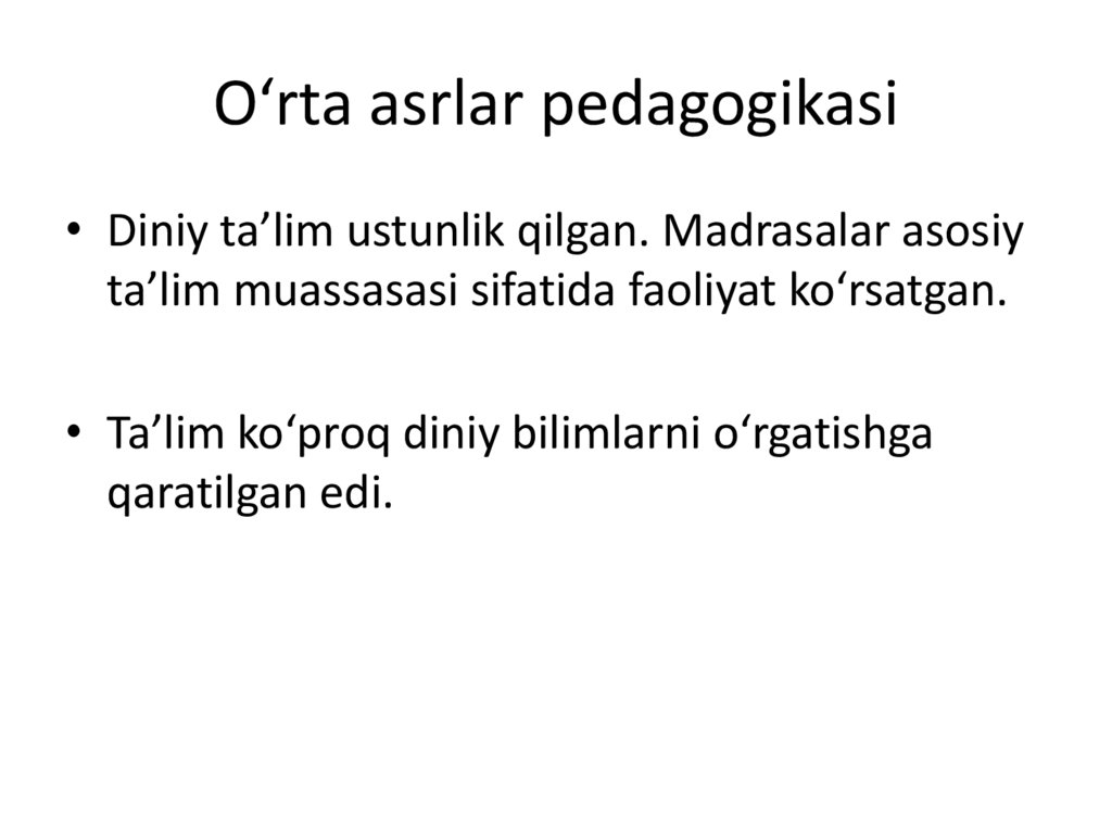O‘rta asrlar pedagogikasi• Diniy ta’lim ustunlik qilgan. Madrasalar asosiy