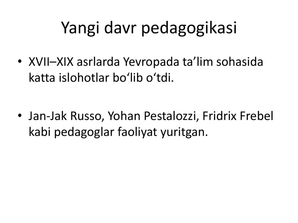 Yangi davr pedagogikasi• XVII–XIX asrlarda Yevropada ta’lim sohasida