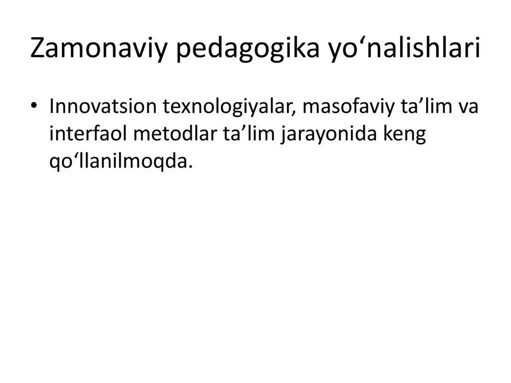 Zamonaviy pedagogika yo‘nalishlari• Innovatsion texnologiyalar, masofaviy ta’lim va