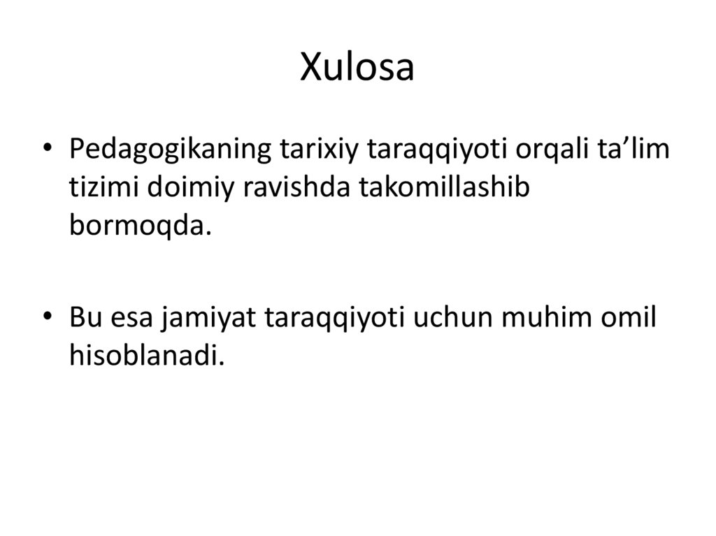Xulosa• Pedagogikaning tarixiy taraqqiyoti orqali ta’lim