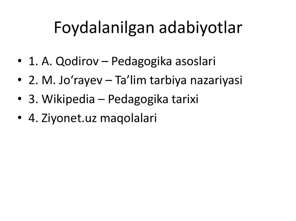 Foydalanilgan adabiyotlar• 1. A. Qodirov – Pedagogika asoslari