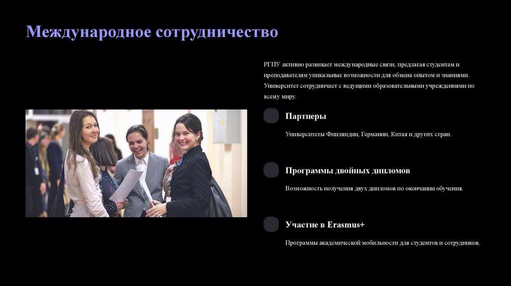 Международное сотрудничествоРГПУ активно развивает международные связи, предлагая студентам и