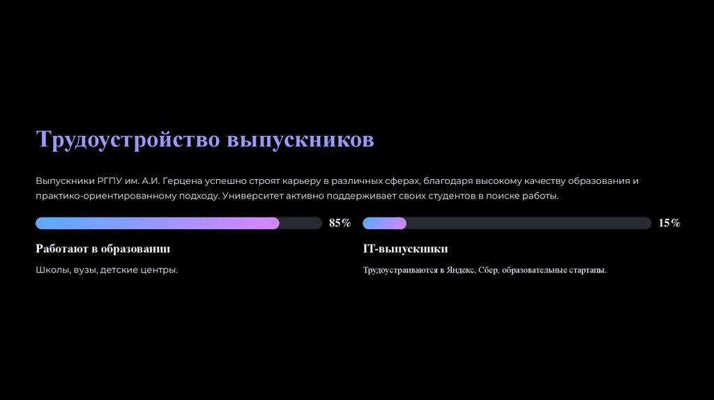 Трудоустройство выпускниковВыпускники РГПУ им. А.И. Герцена успешно строят карьеру в различных сферах, благодаря высокому качеству образования и