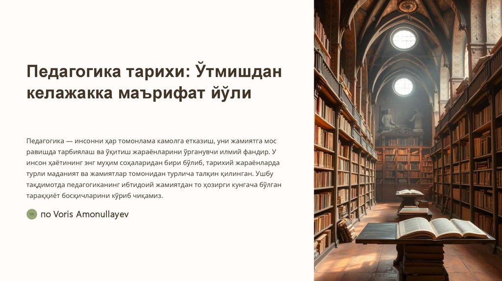 тақдимотда педагогиканинг ибтидоий жамиятдан то ҳозирги кунгача бўлган