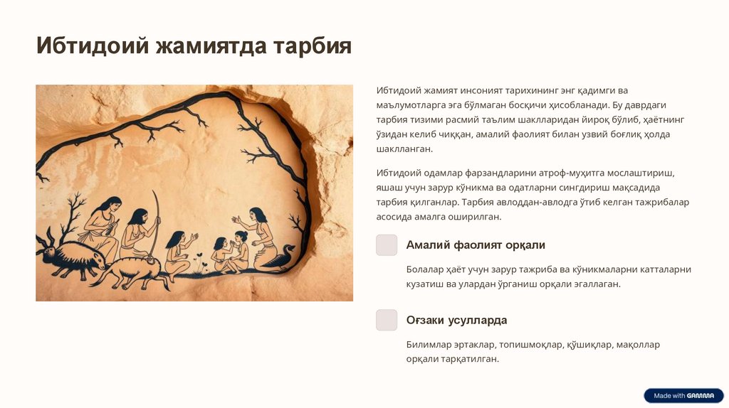 Ибтидоий жамиятда тарбияИбтидоий жамият инсоният тарихининг энг қадимги ва
