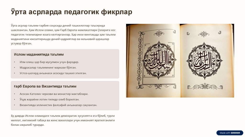 Ўрта асрларда педагогик фикрларЎрта асрлар таълим-тарбия соҳасида диний ташкилотлар таъсирида