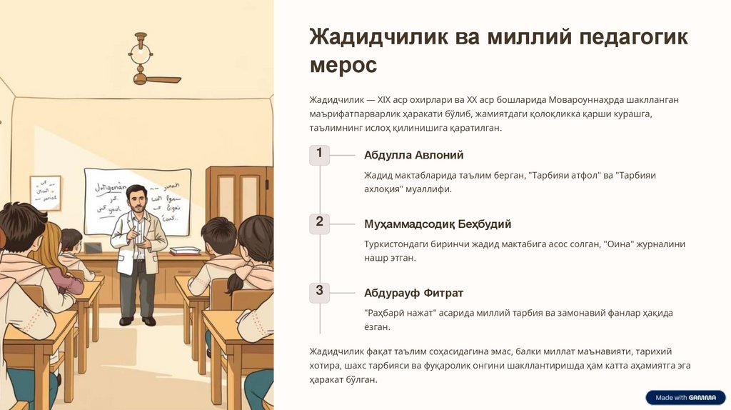 амалга оширилди, мактаблар сони кўпайди. Аммо миллий таълим анъаналари