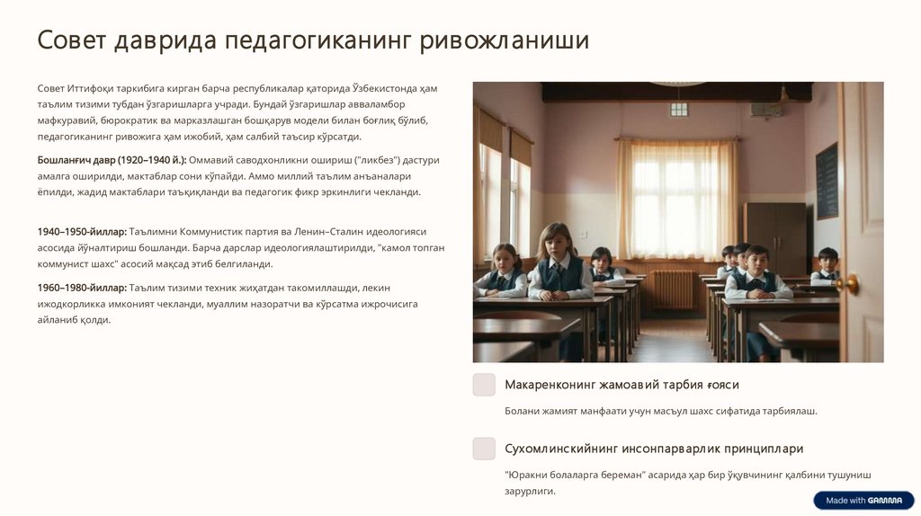 Совет дав рида педагогиканинг ривожл анишиСовет Иттифоқи таркибига кирган барча республикалар қаторида Ўзбекистонда ҳам