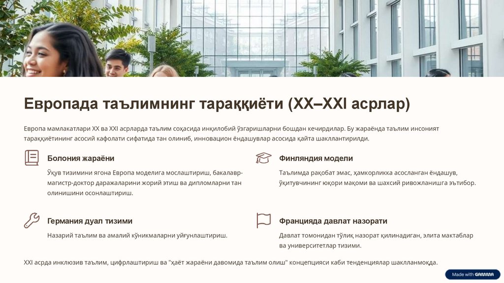 Европада таълимнинг тараққиёти (XX–XXI асрлар)Европа мамлакатлари XX ва XXI асрларда таълим соҳасида инқилобий ўзгаришларни бошдан кечирдилар. Бу жараёнда таълим инсоният