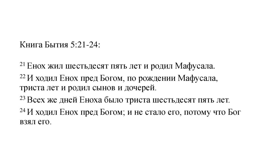 Книга Бытия 5:21-24:21 Енох жил шестьдесят пять лет и родил Мафусала.