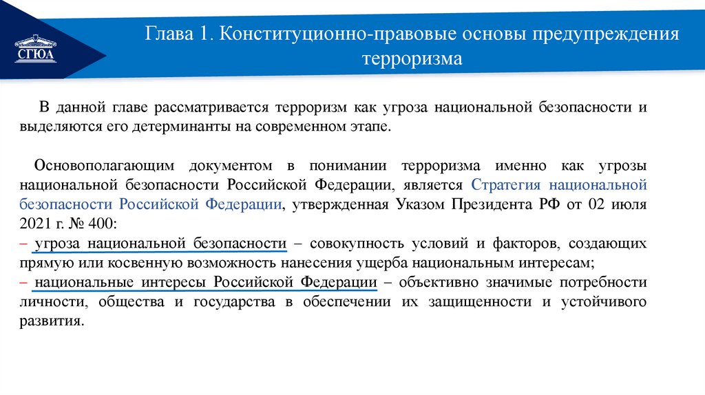 В данной главе рассматривается терроризм как угроза национальной безопасности и