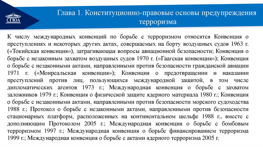 К числу международных конвенций по борьбе с терроризмом относятся Конвенция о