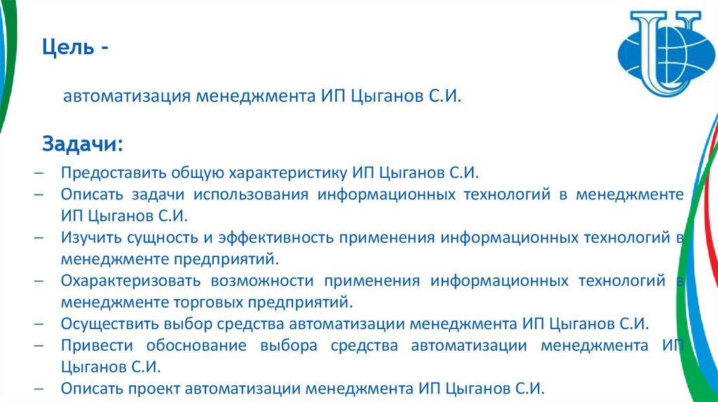 Цель автоматизация менеджмента ИП Цыганов С.И.Задачи: