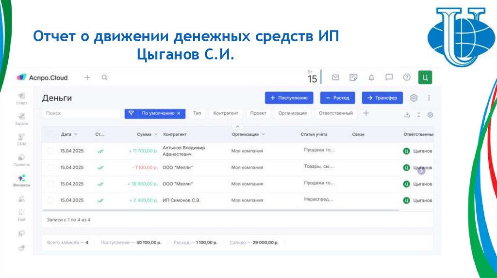 Отчет о движении денежных средств ИПЦыганов С.И.