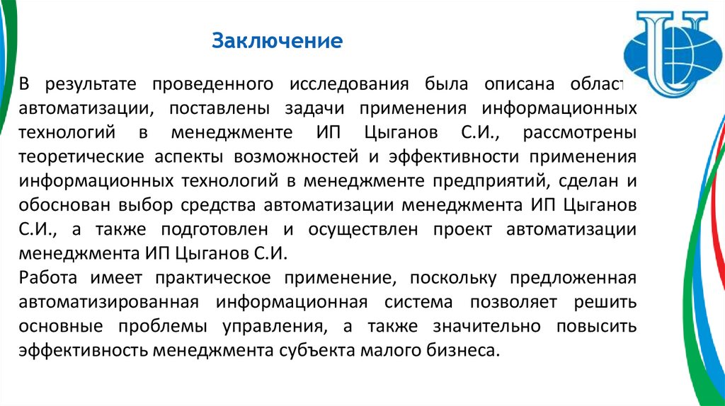 Использование информационных технологий в менеджменте предприятий (на примере ИП Цыганов С.И.)