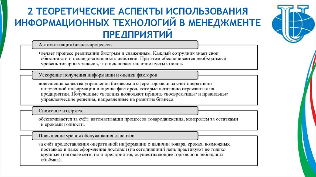2 ТЕОРЕТИЧЕСКИЕ АСПЕКТЫ ИСПОЛЬЗОВАНИЯИНФОРМАЦИОННЫХ ТЕХНОЛОГИЙ В МЕНЕДЖМЕНТЕ