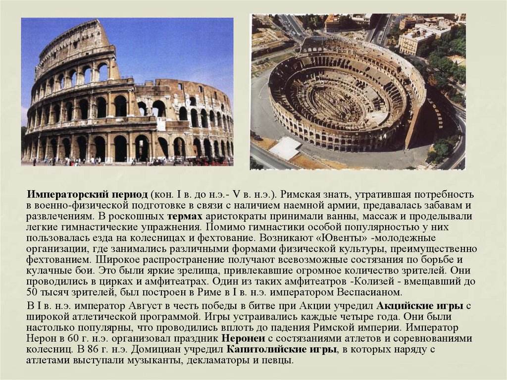 Императорский период (кон. I в. до н.э.- V в. н.э.). Римская знать, утратившая потребностьв военно-физической подготовке в связи с наличием наемной армии, предавалась забавам и