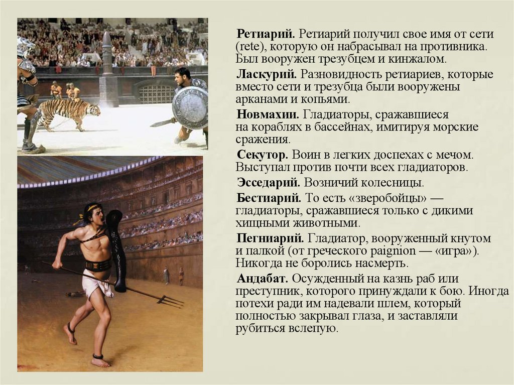 Существовало 13 классов гладиаторов, каждый из которых имел своеоружие и правила для поединков