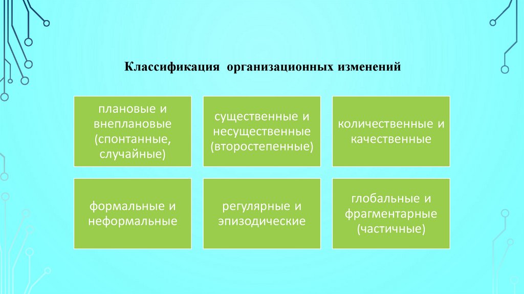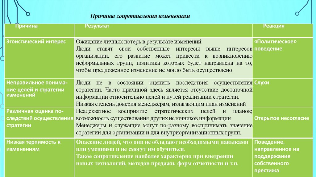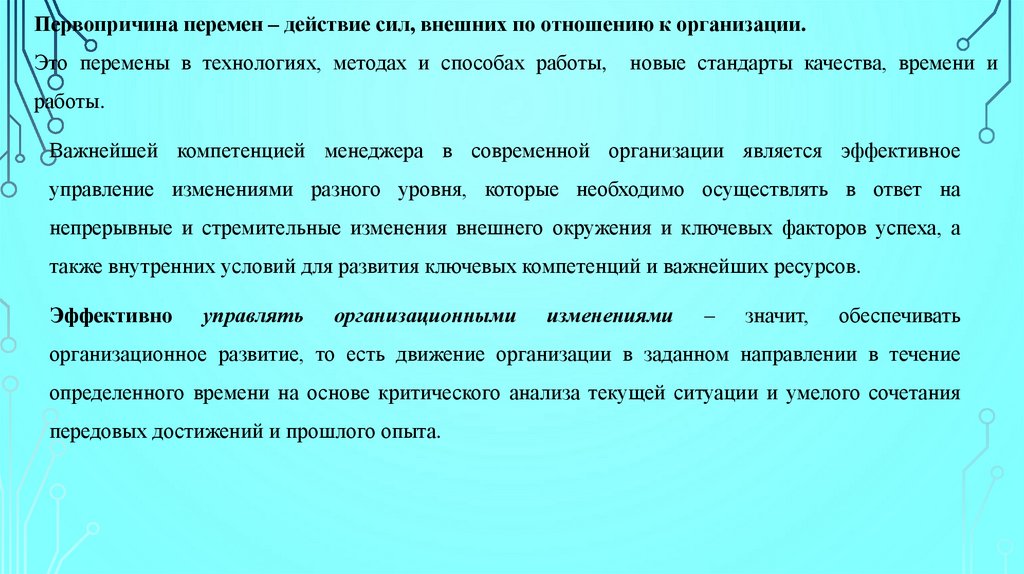Первопричина перемен – действие сил, внешних по отношению к организации.Это перемены в технологиях, методах и способах работы,