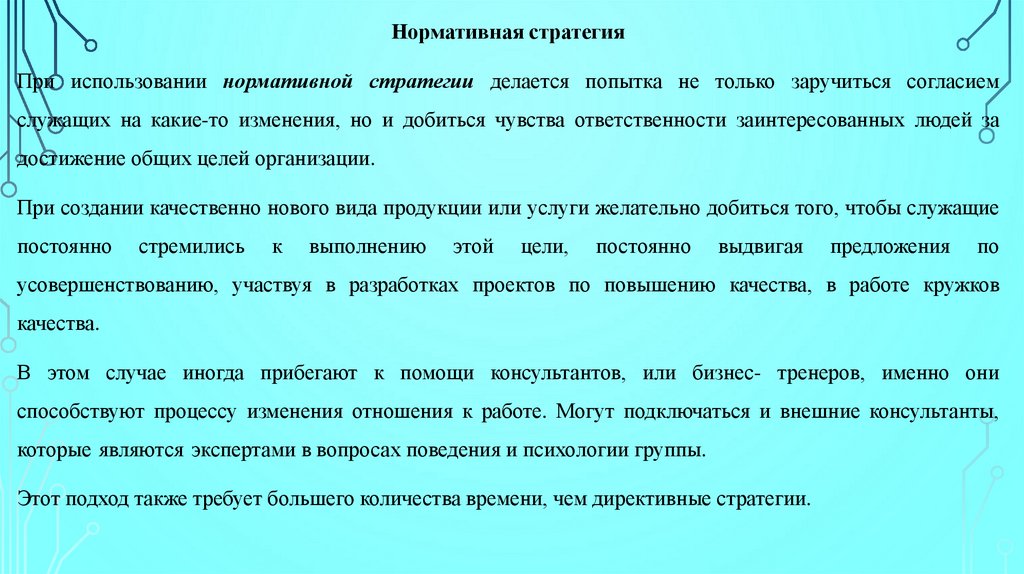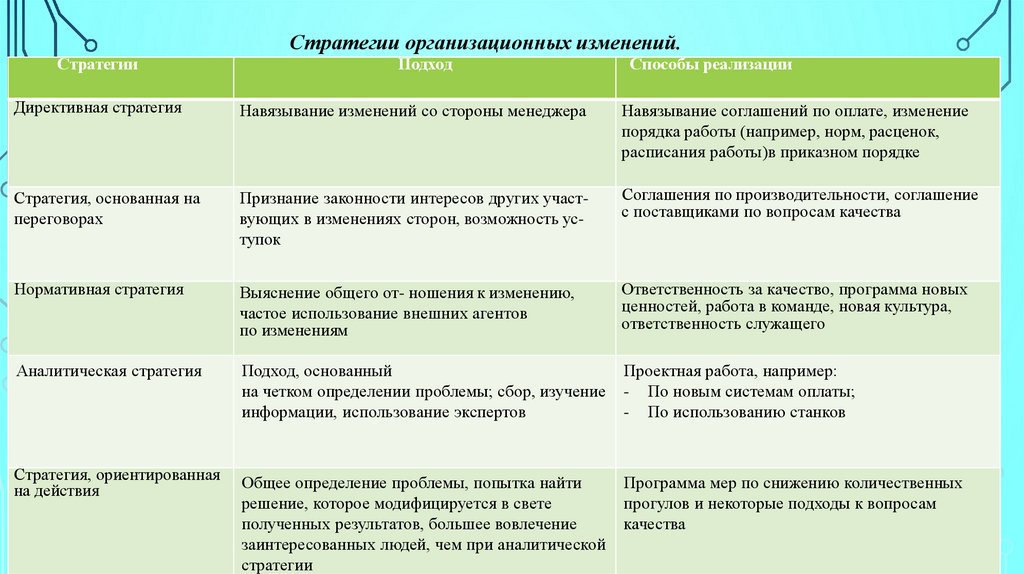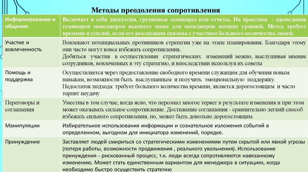 Заставляет людей смириться со стратегическими изменениями путем скрытой или явной угрозы