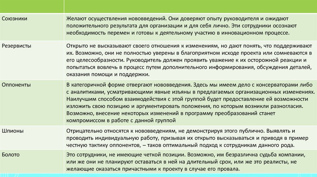 СоюзникиЖелают осуществления нововведений. Они доверяют опыту руководителя и ожидают