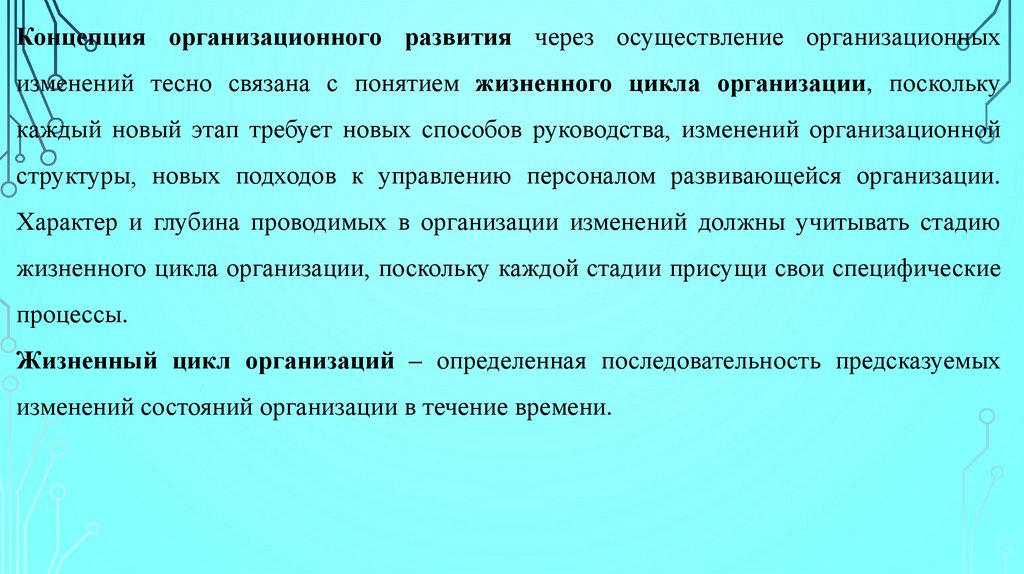 Концепция организационного развития через осуществление организационныхизменений тесно связана с понятием жизненного цикла организации, поскольку