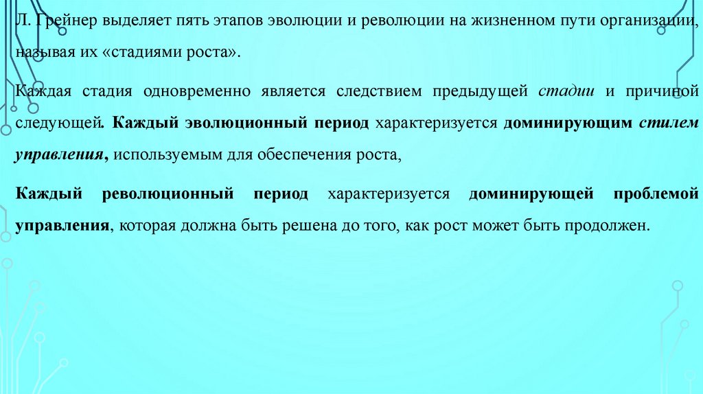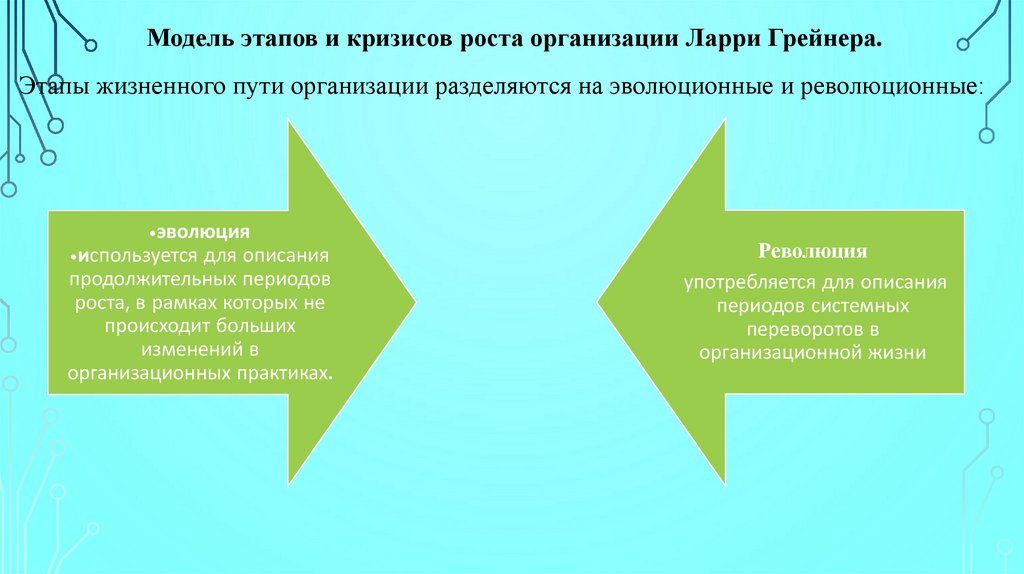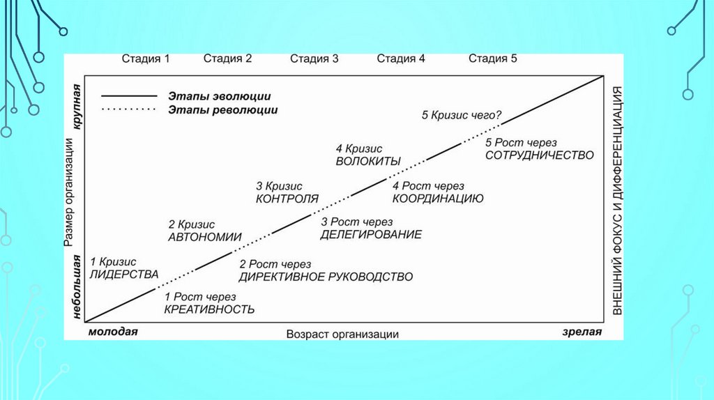 Модель этапов и кризисов роста организации Ларри Грейнера.Этапы жизненного пути организации разделяются на эволюционные и революционные: