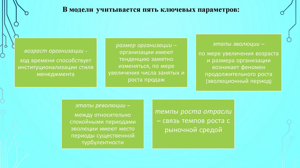 В модели учитывается пять ключевых параметров:возраст организации ход времени способствует
