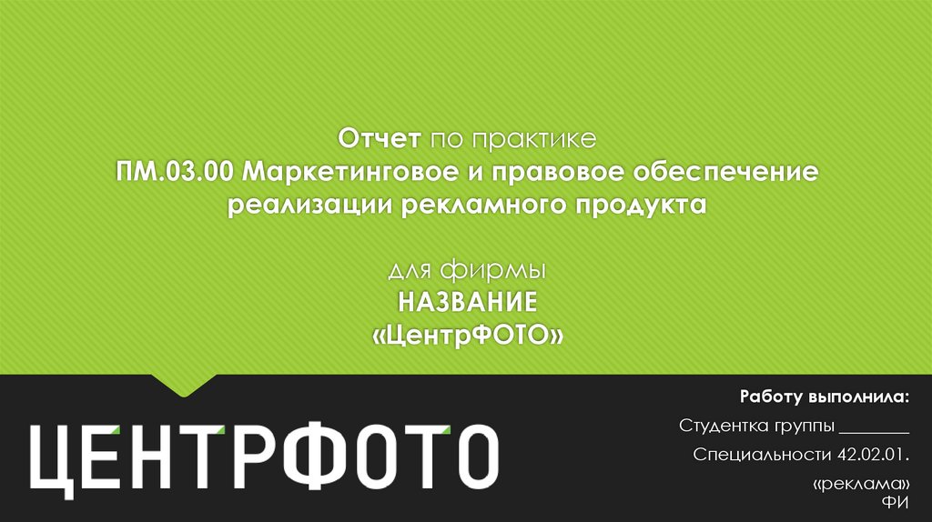1. Отчет по практике ПМ.03.00 Маркетинговое и правовое обеспечение реализации рекламного продукта для фирмы НАЗВАНИЕ «ЦентрФОТО»