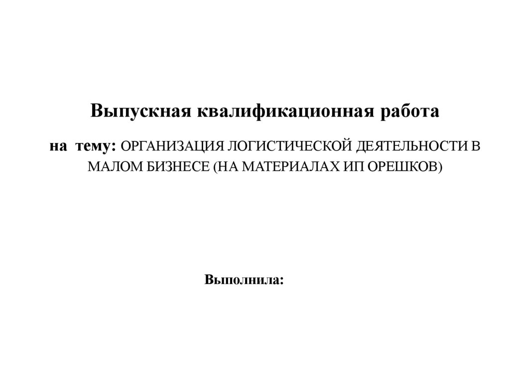 1. Выпускная квалификационная работа на тему: ОРГАНИЗАЦИЯ ЛОГИСТИЧЕСКОЙ ДЕЯТЕЛЬНОСТИ В МАЛОМ БИЗНЕСЕ (НА МАТЕРИАЛАХ ИП ОРЕШКОВ)
