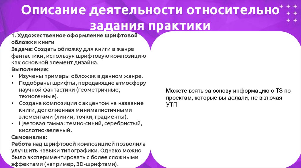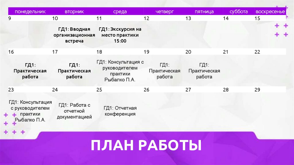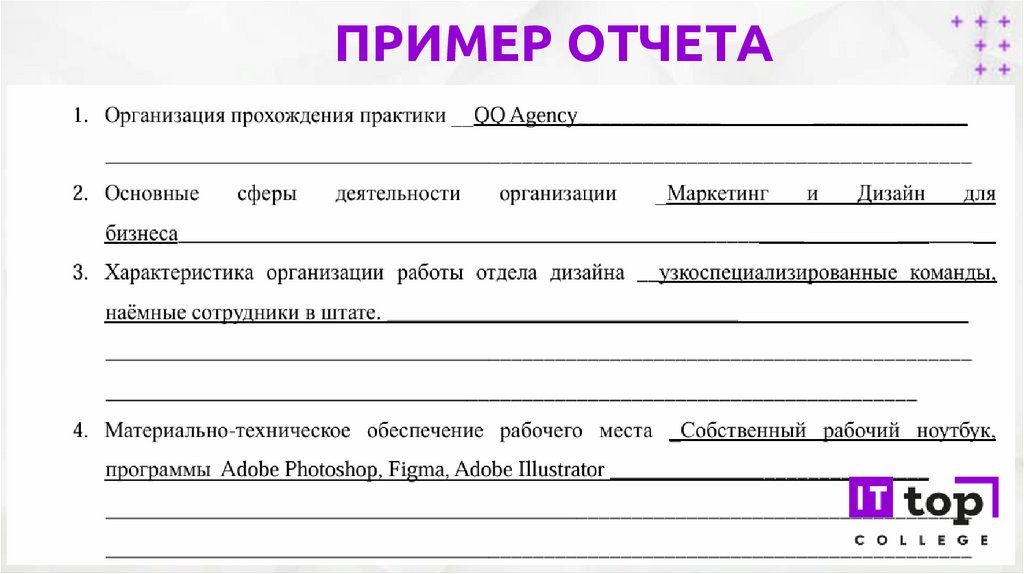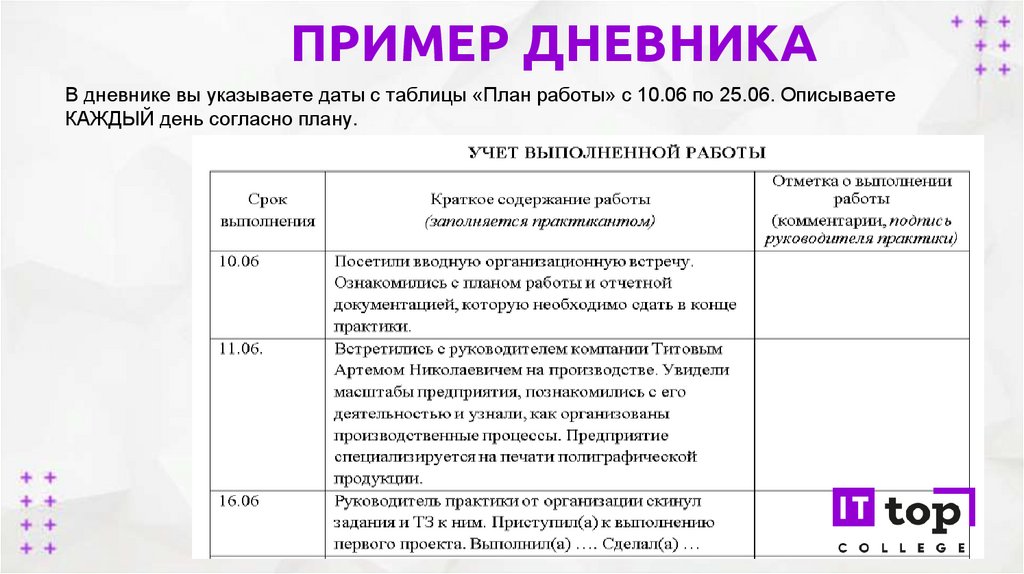 ПРИМЕР ДНЕВНИКАВ дневнике вы указываете даты с таблицы «План работы» с 10.06 по 25.06. Описываете