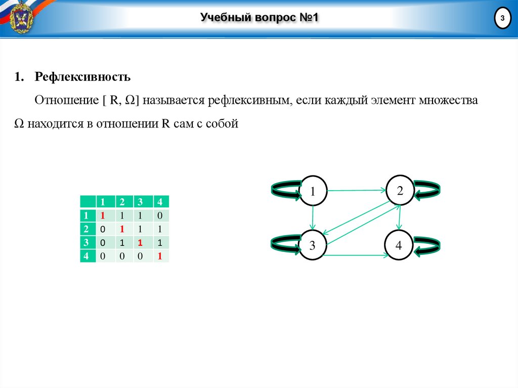 Отношение [ R, Ω] называется рефлексивным, если каждый элемент множества