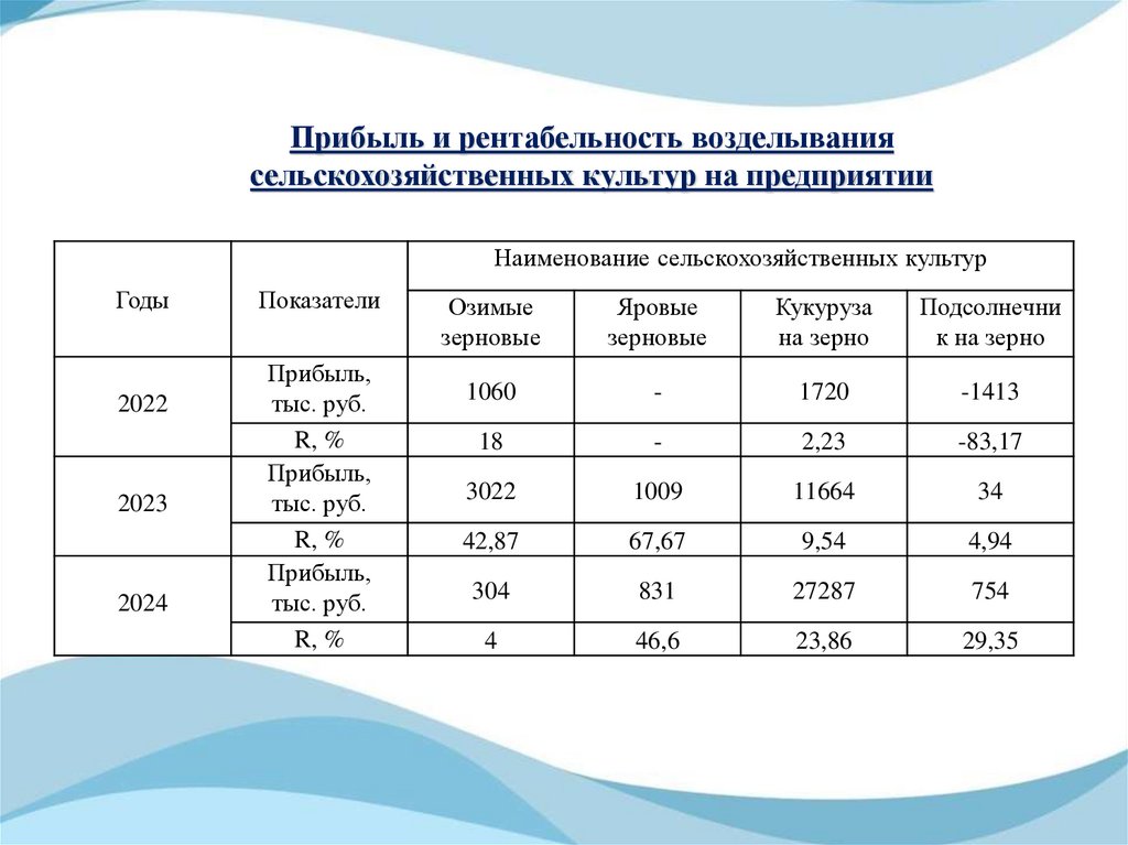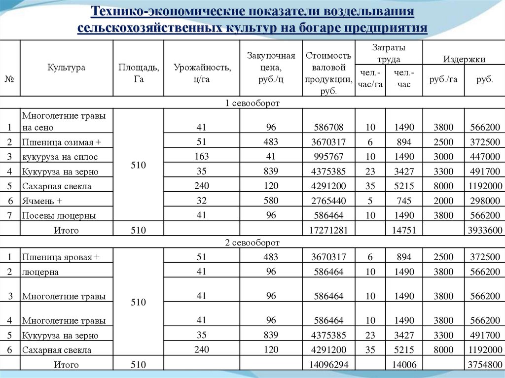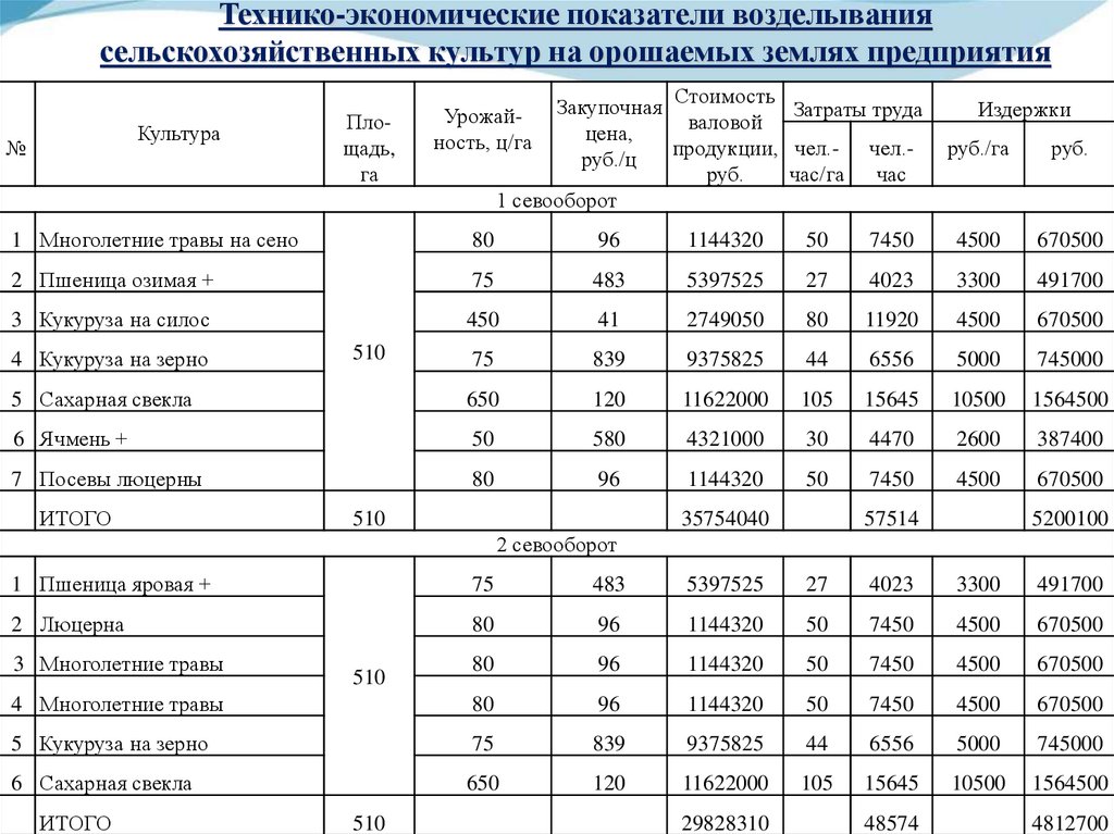 Технико-экономические показатели возделываниясельскохозяйственных культур на орошаемых землях предприятия