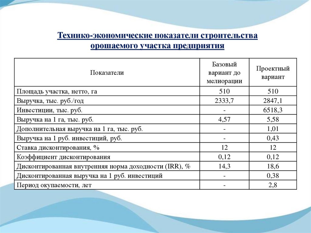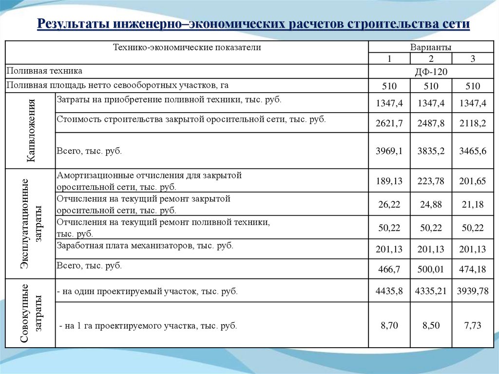 Технико-экономические показатели строительстваорошаемого участка предприятия