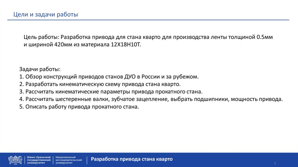 Цели и задачи работыЦель работы: Разработка привода для стана кварто для производства ленты толщиной 0.5мм
