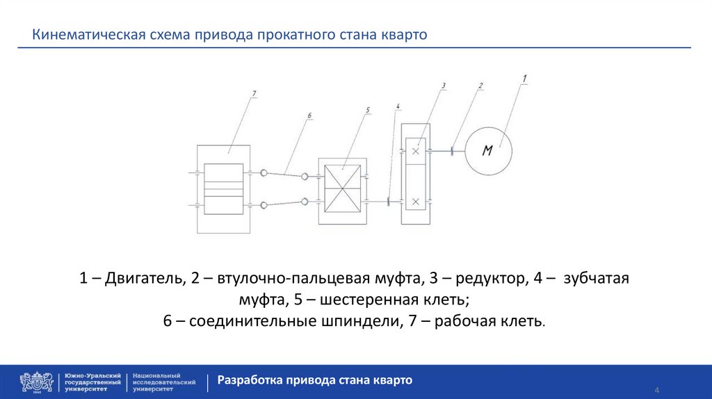 Кинематическая схема привода прокатного стана кварто1 – Двигатель, 2 – втулочно-пальцевая муфта, 3 – редуктор, 4 – зубчатая