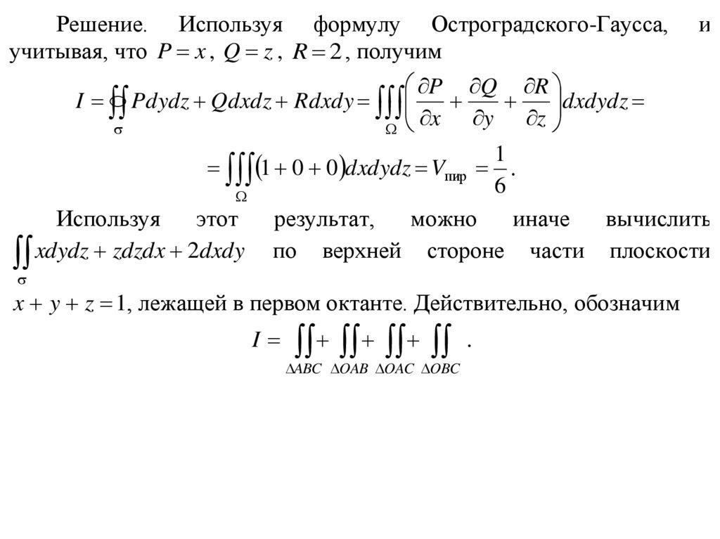 Решение. Используя формулу Остроградского-Гаусса,учитывая, что P x , Q z , R 2 , получим