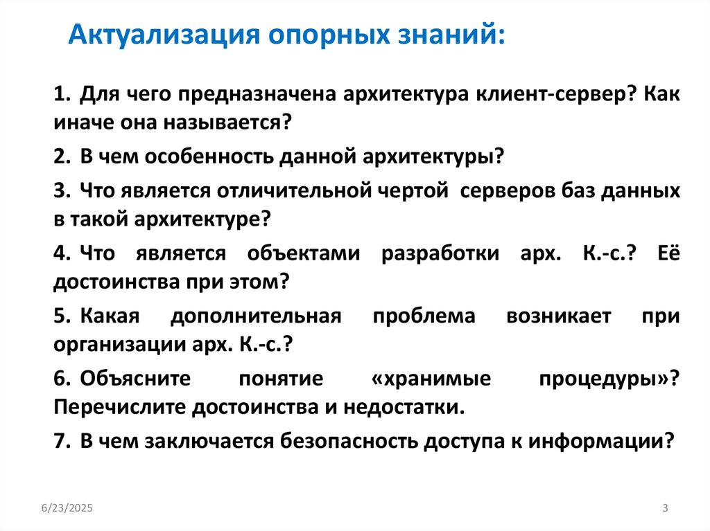Актуализация опорных знаний:1. Для чего предназначена архитектура клиент-сервер? Как