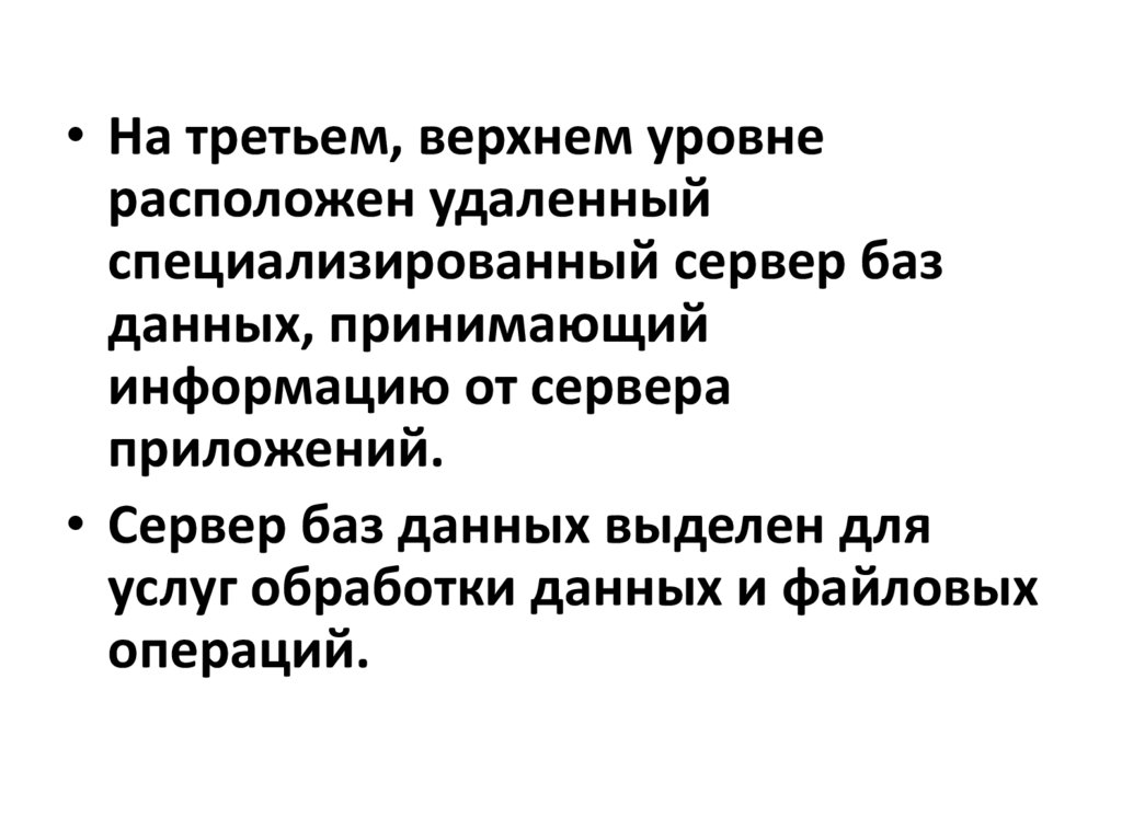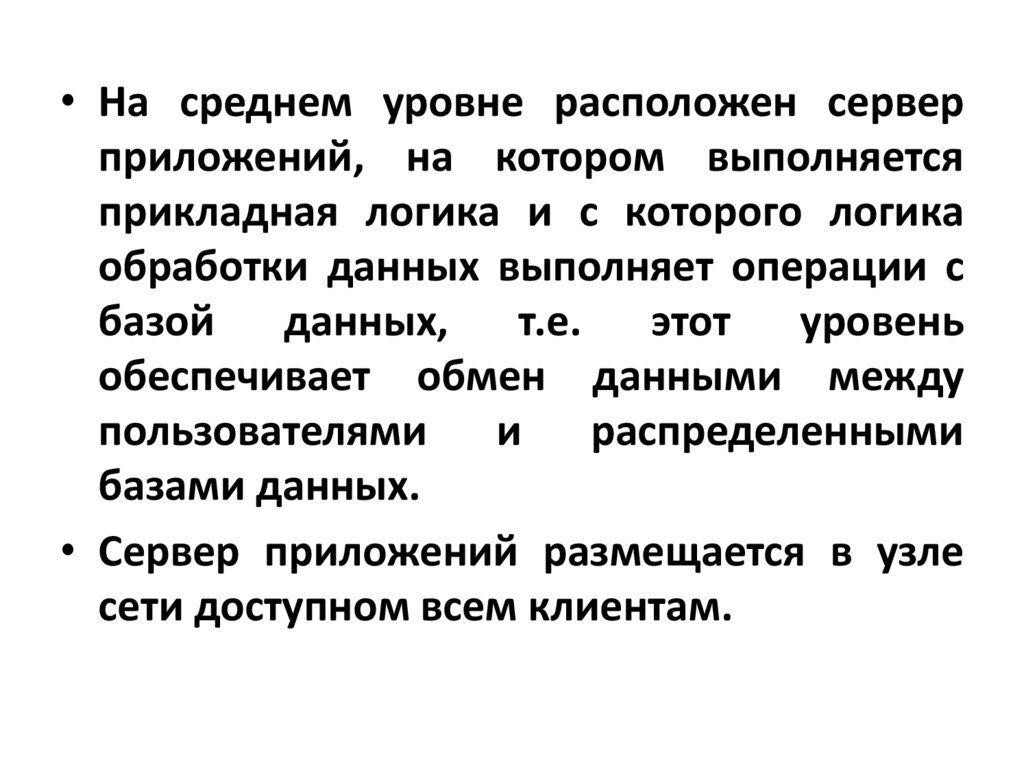 • На среднем уровне расположен серверприложений, на котором выполняется