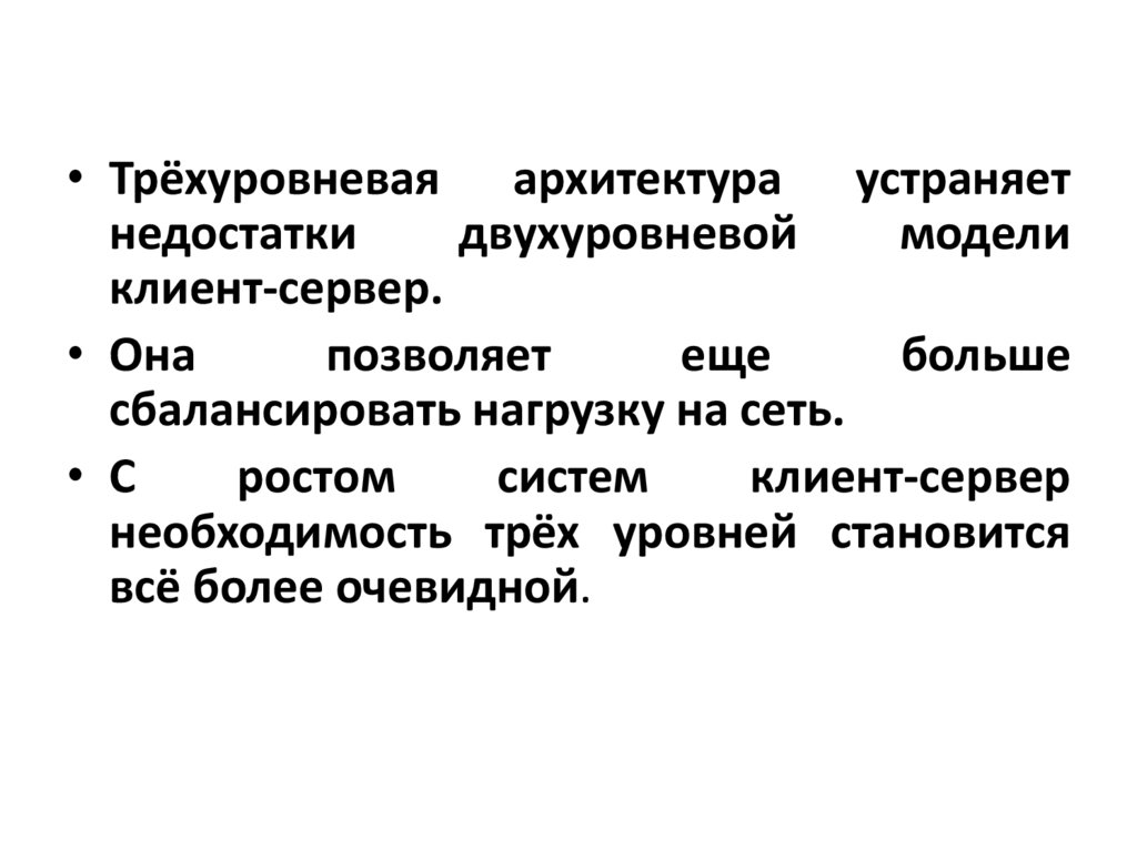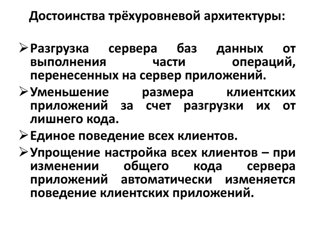Достоинства трёхуровневой архитектуры:Разгрузка сервера баз данных от
