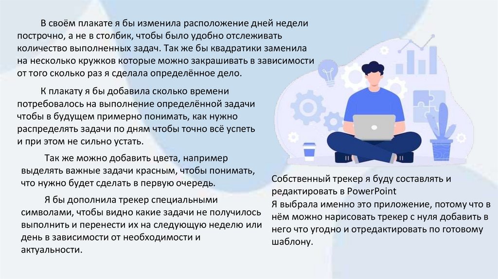 В своём плакате я бы изменила расположение дней неделипострочно, а не в столбик, чтобы было удобно отслеживать