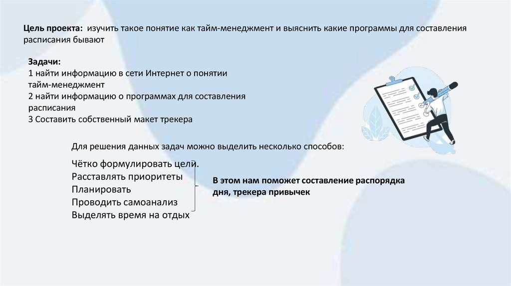 Цель проекта: изучить такое понятие как тайм-менеджмент и выяснить какие программы для составлениярасписания бывают